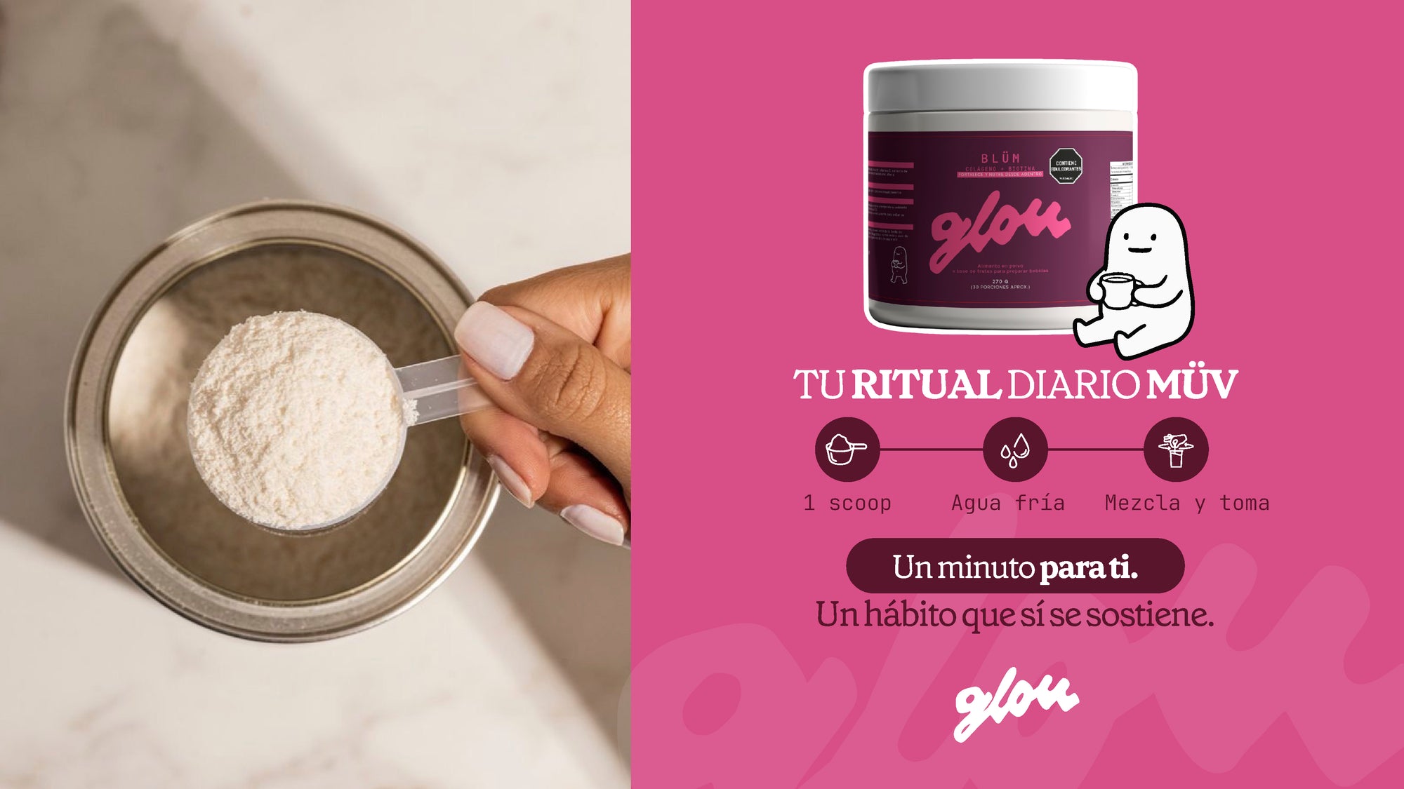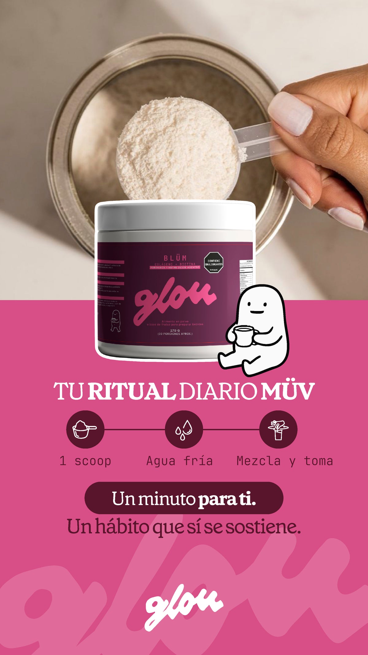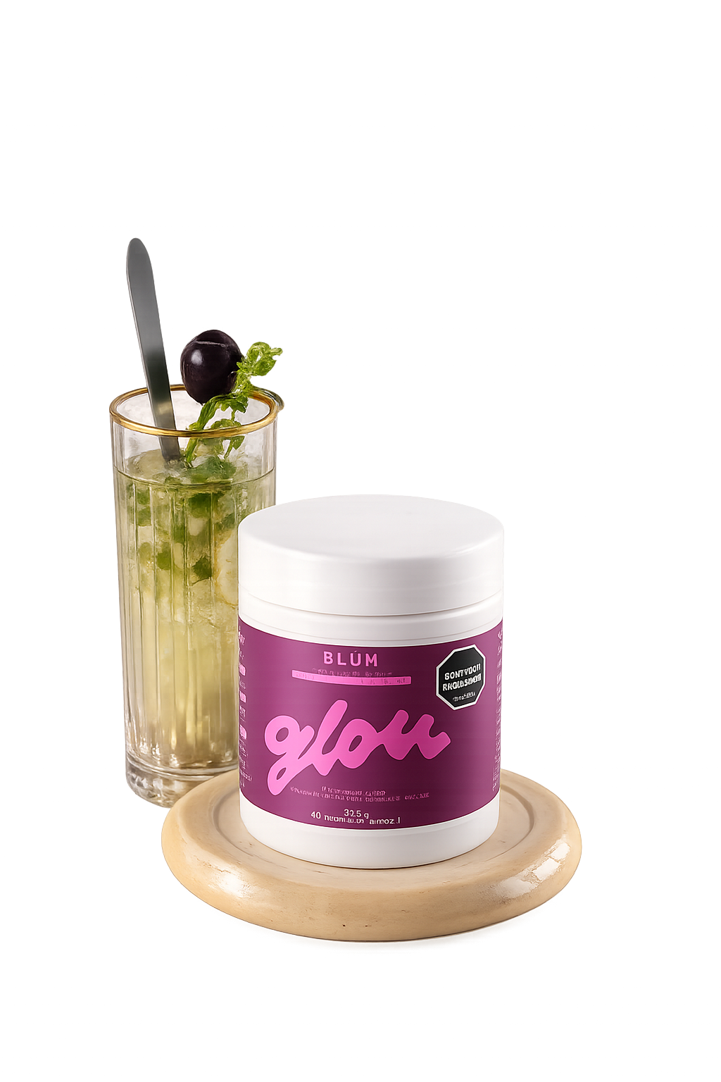 Disuelve 1 scoop de Blüm (aprox. 7 g) en 200–250 ml de agua fría o tu bebida favorita.